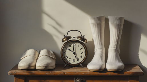 носки, будильник, тапки На первый взгляд — просто вещи. Но вместе они рассказывают историю: утро, чёткий ритуал, человек, который знает, с чего начинается день. Никаких лиц, действий, описаний интерьера — только три предмета, выстроенных в пространстве. Результат — изображение с ощущением уюта и контроля: будильник показывает раннее утро...
