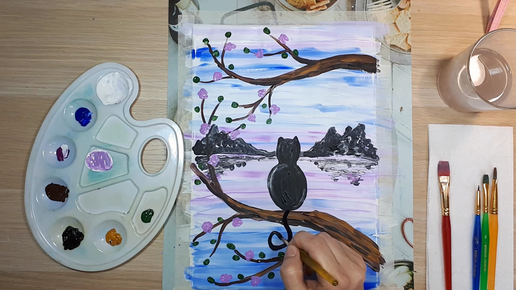 В этой статье я Вам расскажу, как с детьми можно красиво нарисовать нежную весеннюю картину гуашью - кошку, которая сидит на ветке и любуется рассветом. Эту картинку гуашью могут нарисовать даже дети от 5 лет, но она будет интересна и для старших детей, и даже для взрослых...
