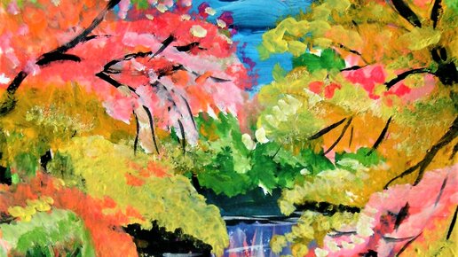 Друзья, проведем время самоизоляции и каникул с пользой! Займёмся развитием творческих способностей. Эти пейзажи я рисовала гуашью и акрилом на листе А4. 1. Цветущие деревья вокруг пруда(реки). Девушка в голубом на мостках. Этот первый пейзаж советую рисовать разноцветными пятнами - массы листвы. Не заморачивайтесь особо их расположением. Берите розовые, нежно-зеленые, желтые, оранжевые цвета. В верхней части листа ветки и стволы направлены вверх и к середине. Деревья и вверху, и внизу как бы нависают над водой...