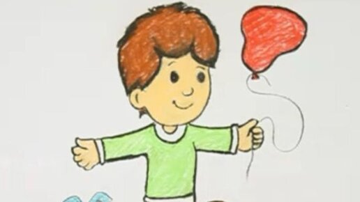 В верхней части листа рисуем голову, начиная с волос. Стрижки у мальчиков обычно короткие, чтобы передать объем используем зигзагообразную линию. Ровной линией очертим лицо, но соединят ее с нижней частью волос не нужно. Теперь изобразим ухо. Затем нарисуем шею и округлый воротничок рубашки. Расположение рукавов рубашки зависит от положения рук персонажа. Наш мальчик будет держать воздушный шарик, поэтому его руки раскинуты в стороны. Отразим это на рисунке. Далее рисуем штанишки. Ноги мальчика обуваем в ботинки...