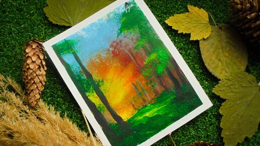 Как нарисовать яркий "Закат в лесу" акриловыми красками на картоне губкой поэтапно