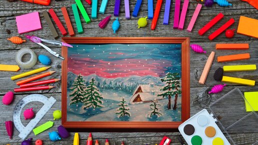Подробный урок рисования, который поможет изобразить красивый зимний закат. Вам понадобятся: Этапы работы: 1. Располагаем лист горизонтально. Простым карандашом намечаем на заднем плане горы и возвышенность на переднем плане. Старайтесь не давить на карандаш, едва задевая бумагу. 2. Создаём наметку домиков и сосен в правой части листа. 3. Теперь нарисуем деревья вдали и несколько ёлочек на переднем плане. 4. Начинаем раскрашивать рисунок. Для крыш используем голубую и белую гуашь. 5. Далее раскрасим сугробы...