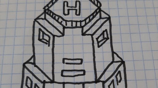 Возмём лист бумаги в клеточку и пишущий предмет(у меня это чёрный фломастер) Теперь нарисуем начало рисунка Потом проведём линии в правую сторону(линии в 2 клеточки) Проводим точ в точ такие же линии только в левую сторону Соеденяем линии...