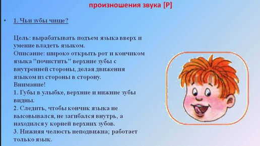 Положение языка должно быть плоским и широким: отучайте ребенка произносить фрикативные звуки задней частью языка. Правильный звук «р» произносится широким кончиком языка, слегка прижатому к твердому небу...