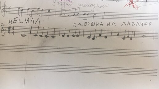 Когда обучающийся освоил ноты первой октавы и тему "длительности" я даю задание "заполни такты". Иногда сама ставлю размер, иногда прошу выбрать самостоятельно. Когда дело сделано, я прошу сыграть написанное, дать название и характер игры. Так рождается творческое мышление... И вроде бы ничего особенного в задании "заполни такты", однако - это почти тоже самое, что "сочини мелодию", только без претензии на что-то. Проверьте свои знания. На фото пьеса "Бабушка на лавочке": Если вы легко справились...