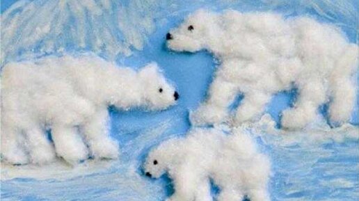 Сегодня мы расскажем о поделке, которую интересно и просто будет сделать ребенку в любом возрасте. Нам понадобится: - Лист картона синего или голубого цвета; - Белый карандаш; - Клей; - Вата; - Черные нитки. 1. На синем картоне рисуем фигуры наших будущих белых медведей...