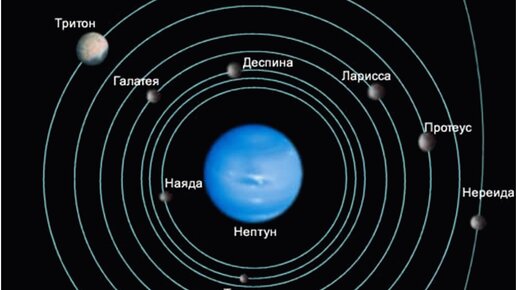 На сегодня известно 14 спутников Нептуна. Большинство из них – маленькие ледяные «картофелины» или груды щебня – и всё же в системе Нептуна есть немало вещей, представляющих интерес для астрономов. Тритон Это самый крупный спутник Нептуна – его диаметр равен 2706 км. Его поверхность очень хорошо отражает свет, поэтому спутник открыт еще в XIX веке, 10 октября 1846 года английским астрономом Уильямом Ласселом. Но еще много лет после своего обнаружения спутник оставался безымянным: имя «Тритон» предложил французский астроном Камиль Фламмарион в 1880 году...