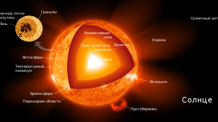 Внутреннее строение Солнца Диаграмма внутреннего строения Солнца. Солнечное ядро Основная статья: Солнечное ядро Центральная часть Солнца с радиусом примерно 150—175 тыс. км (то есть 20—25 % от радиуса Солнца), в которой идут термоядерные реакции, называется солнечным ядром. Плотность вещества в ядре составляет примерно 150 000 кг/м³ (в 150 раз выше плотности воды и в ~6,6 раз выше плотности самого плотного металла на Земле — осмия), а температура в центре ядра — более 14 млн К. Анализ данных, проведённый...