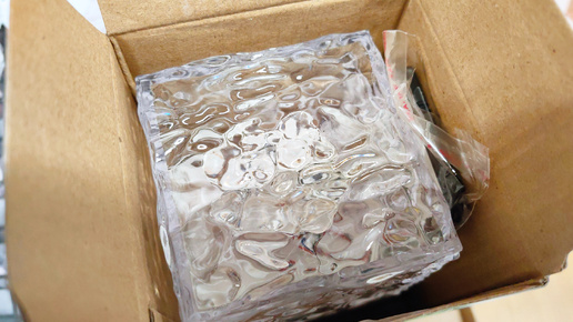 Новинки в магазине Чижик. Вот такие "льдинки" в коробках. И не только эта новинка, много всего на полочках. Но начну именно с квадратного куска "льда". Посмотрим, что это такое и пригодится ли дома. В коробке вот такой куб на белой подставке, верхняя часть не гладкая, поверхность очень похожа на застывший кусок льда. Это светильник. Называется Северное сияние. Светит разными оттенками, ярко, на потолке и стене будет красивый эффект северного сияния. Кнопка включения внизу на подставке, почти незаметна...
