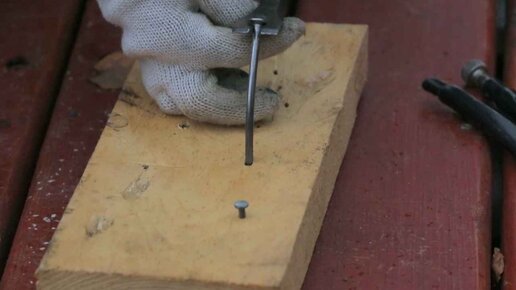 Действуем специальным инструментом и аккуратно. Гвоздь удобно вытаскивать инструментом, который называется монтажка. Монтажку завести под шляпку гвоздя. Тянуть. Если в процессе работы гвоздь не вытащился, а шляпка обламалась, следует воспользоваться зажимом-собачкой. Захватить зажимом гвоздь. Использовать его в качестве шляпки: подвести под него монтажку и тянуть...