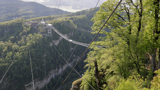 Это одно из интересных мест недалеко от Сочи. Пешеходный подвесной мост соединяет «берега» Ахштырского ущелья, по дну которого течет река Мзымта, и проходит Краснополянское шоссе. Это один из самых длинных подвесных пешеходных мостов в мире и самый длинный в России. Длина его 439 метров. Создатели уверяют, что их небесный мост (они называют его по-иностранному Скайбридж) может выдержать любые нагрузки, поскольку рассчитан по всем нормам безопасности с большим запасом. Мост должен устоять, даже если...