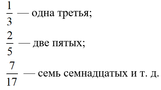 Сразу стоит пояснить, как такие дроби называть. Сначала читают числитель дроби, потом знаменатель. Например, Зачем нам нужно записывать такое действие как деление в виде дроби? Дробь — это часть числа. Что значит часть числа? Разберем дробь подробнее. Верхнее и нижнее число дроби имеет свои названия...