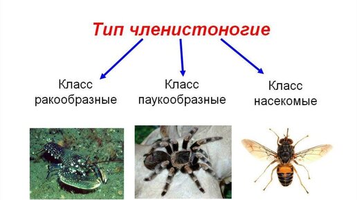 Тип Членистоногих разделяется на три класса - Ракообразные, Паукообразные и Насекомые. Тело Членистоногих - сегментировано. То есть, тело разделено на отдельные кусочки (сегменты). Выделают три отдела тела: Встречаются случаи, когда два отдела совмещены в один, например у раков имеется головогрудной панцирь.