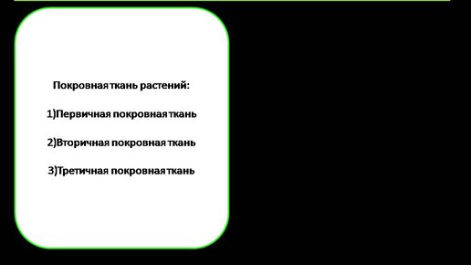 Ткань (растений, животных) - группа клеток, сходных по строению и происхождению, выполняющих сходную функцию Покровная ткань растений подразделяют на: 1)Первичная покровная ткань Эпидерма (кожица) - плотно прилегающие друг к другу живые клетки. Имеют устьица 2)Вторичная покровная ткань. Пробка - мертвые клетки. Обычно пробка имеет чечевички, необходимые для газообмена 3)Третичная покровная ткань...