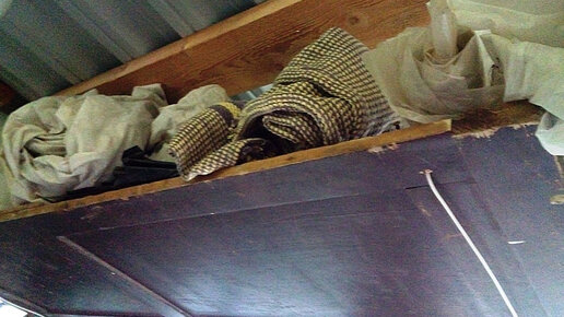 Навесные полки под потолком навеса. Удобно хранить рулоны пленки и укрывного материала