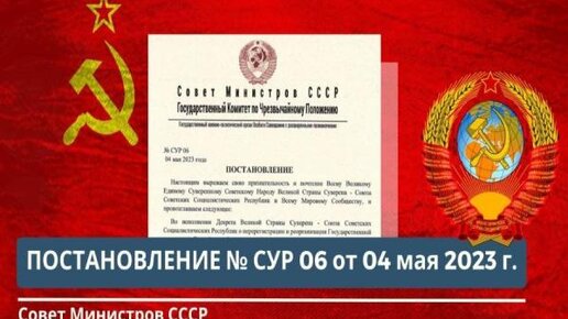 № СУР 06 04 мая 2023 года ПОСТАНОВЛЕНИЕ Настоящим выражаем свою признательность и почтение Всему Великому Единому Суверенному Советскому Народу Великой Страны Суверена - Союза Советских Социалистических Республик и Всему Мировому Сообществу, и провозглашаем следующее: Во исполнения Декрета Великой Страны Суверена - Союза Советских Социалистических Республик о перерегистрации и реорганизации Государственной компании «Российская Федерация - Россия» № ПВК-033 от 23 марта 2023г., Постановления Государственного Комитета по Чрезвычайному Положению СССР № СУР 01 от 30 марта 2023г...