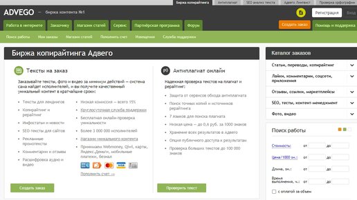 Развитие глобальной сети привело к появлению профессии копирайтера, позволяющей работать из дома. Достаточно иметь стабильное интернет-соединение и компьютер. Есть множество бирж копирайтинга, помогающих найти заказы новичкам и опытным фрилансерам, но рекомендуется ознакомиться с лучшими из них. Перейти Здесь публикуются заказы на копирайтинг, рерайтинг, переводы, корректура текстов и др. Advego - биржа для фрилансеров широкого профиля. Рейтинг формируется как у исполнителя, так и у заказчика...