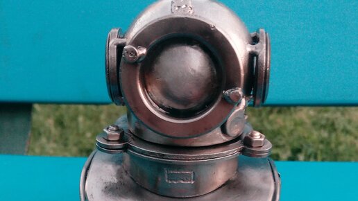Недавно позвонил человек,спросил,не могу ли я сделать такой-же по габаритам,но ближе к нашему шлему трехболтовке. "В шлеме УВС-50М в отличие от УВС-50 имеется латунный рым » виде скобы для подвеса шлема при одевании и раздевании, а также для подъема при появлении аварийной ситуации с водолазом"-цитата. Почему бы и да... Шлем как обычно сделан в стиле ресайкларт,те с использованием металлолома и запчастей...