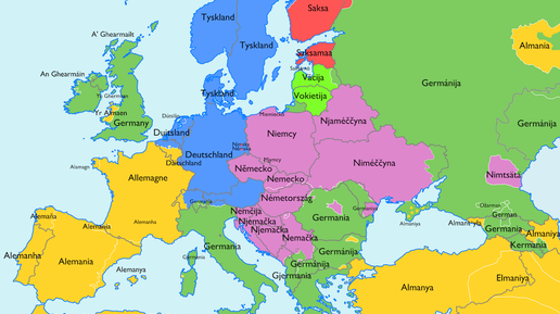 Карт будет немного,но на мой взгляд они довольно интересные. 1.Германия Германию называют в основном четырьмя разными словами образованными образованными корнями от слов"немец","дойч или туск","аллеман" и "германец"."Немецией" эта страна зовётся почти у всех славян(кроме русских, болгар и македонцев) венгров и калмыков(означает "страна немых" т.е. неговорящих на местном языке)."Аллеманией" немецкая земля прозвана у западноевропейских народов романского происхождения,арабов,персов,некоторых тюркских народностей...