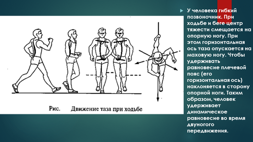 - У человека гибкий позвоночник. При ходьбе и беге центр тяжести смещается на опорную ногу. При этом горизонтальная ось таза опускается на маховую ногу. Чтобы удерживать равновесие плечевой пояс (его горизонтальная ось) наклоняется в сторону опорной ноги. Таким образом, человек удерживает динамическое равновесие во время двуногого передвижения. - При вертикальном положении тела в стойке прямо (а) плечевой, тазобедренный, коленный и голеностопный суставы находятся на одной вертикальной линии, что позволяет идеально удерживать равновесие в положении стоя...