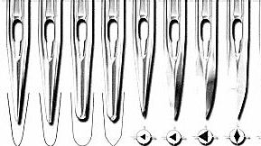 Иглы разных номеров предназначены для стачивания материалов различной плотности и толщины нитками соответствующих номеров. Игла (см. рисунок ниже) в большинстве швейных машин представляет собой прямой цилиндрический стержень неодинакового сечения, заостренный на одном конце. Утолщенная часть иглы называется колбой. Она предназначена для закрепления иглы в игловодителе.