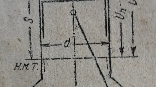 Положение поршня цилиндра (рис. 12) при котором расстояние от поршня до оси коленчатого вала двигателя будет наибольшим, называется верхней мёртвой точкой (в м. т.). Положение поршня в цилиндре, при котором расстояние от точки до оси коленчатого вала будет наименьшим, называться нижней мёртвой точкой (н. м. т.). Расстояние по оси из цилиндра между верхними и нижними мёртвыми точками называется ходом поршня S. При каждом ходе поршня и коленчатый вал поворачивается на половину оборота, то-есть на 180°...