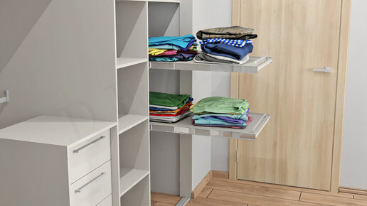 Вот такие полки предложил сделать клиенту в глубоком шкафу. Думаю это хоть как то облегчит доступ к вещам что будут находиться у стены, в глубине шкафа. Сам фасад теперь выглядит вот так, по просьбе клиента...