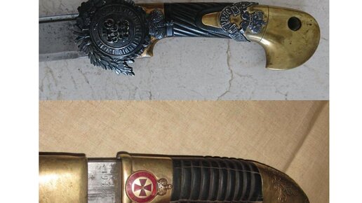 Самый интригующий в этом отношении вопрос заключается в том, что если показать стороннему человеку, например, вот эту пару шашек: И спросить - какая, по-вашему, ценнее? - он, вполне возможно, скажет: верхняя. На ней вон какой знак, огромный, на пол-эфеса, с императорским вензелем, с разлапистым венком из лавровых листьев, и еще второй на рукояти. А на нижней - так, ерунда какая-то, маленький красный крестик под маленькой же короной, совсем невзрачный по сравнению с первым... А на самом деле здесь...