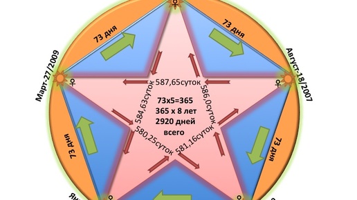 Начнём с того, что на рисунке это своеобразные планетные часы, где один час приравнивается к 73 дням, а половина суток в которых 5 часов – к одному году. Два оборота воображаемой стрелки этих часов покажут 10 часов или два года по 365 дней. В начало отсчёта мы ставим верхнее соединение Венеры с Солнцем в период её прохождения по диску Солнца 8 июня 2004 года. Далее отмеряем полный круг или год, состоящий из пяти отрезков по 73 дня, и добавляем ещё три отрезка по 73 дня – итого получается (5 х 73) + (3 х 73) = 584 дня – это синодический период Венеры...