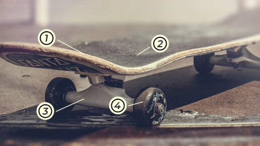 Скейтборд состоит из четырёх основных элементов: Основные стили скейтбординга Флэтленд (от flat — «плоский», land — «земля») — самый первый стиль, появившийся в 1960-х и предполагавший катание и выполнение трюков исключительно на ровной горизонтальной поверхности без каких-либо препятствий. Фристайл (Freestyle) — один из основополагающих стилей, зародившийся в конце 1960-х на базе флэтленда. Отличается от первого тем, что трюки выполняются практически на одном месте, при этом райдер активно задействует не только ноги, но и руки и выполняет акробатические элементы...
