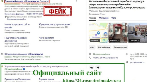 ❗️ Осторожно! Фейковые сайты! Недобросовестные граждане активно используют тактику подмены сайтов для обмана невнимательных людей. Внимательно смотрите, что вам предлагает поисковик. Например, в интернете был замечен сайт, выдающий себя за сайт Управления Роспотребнадзора по Красноярскому краю...