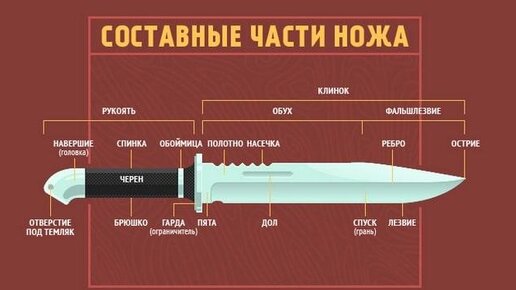 Сразу оговорюсь, что бы в конце статьи меня камнями не закидали :) Эти части присутствуют не на всех ножах, но некоторые встречаются довольно часто. А те, кто покупает такие ножи, порой и не в курсе для чего эти части предназначены. Про это сейчас и расскажу. Но для начала немного ликбеза. Вот плакат, который мы готовили уже очень давно, но его актуальность и сейчас без сомнения. Качайте (бесплатно), смотрите, знакомьтесь — здесь представлены более 50 частей, которые могут встречаться у ножа и их обозначения...