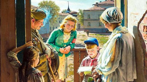 Эта солнечная картина знакома многим с детства. На ней изображены простые люди, читающие письмо. Судя по названию полотна, весточка «прилетела» с фронта. Жители дома улыбаются — сразу видно, что солдат прислал хорошие вести. Возможно, дело идёт к окончанию войны. Полотно называется «Письмо с фронта» и основано на реальных событиях. Его создал художник Александр Лактионов, который в 1944 году из эвакуации прибыл в подмосковный Сергиев-Посад (Загорск) и поселился в Троице-Сергиевой Лавре, которая в то время использовалась под жильё и склады...