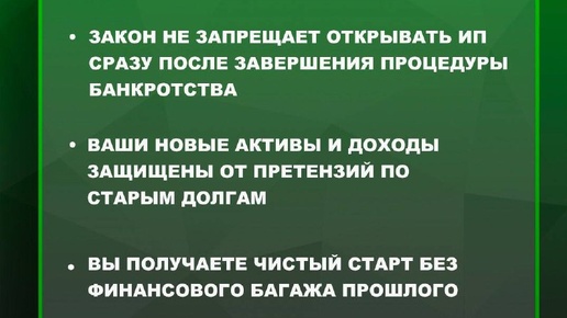 🔥 БАНКРОТ И БИЗНЕСМЕН: КАК ОТКРЫТЬ СВОЁ ДЕЛО СРАЗУ ПОСЛЕ БАНКРОТСТВА (И ПОЧЕМУ ЭТО РАБОТАЕТ!) "Банкротство — это конец бизнес-карьеры" — один из самых опасных мифов, который мешает людям начать новую жизнь. Представьте: вчера вы были в долгах, а сегодня открываете собственное ИП без страха, что прошлые кредиторы предъявят свои требования. Звучит как мечта? Нет — это реальность, доступная каждому! История нашей клиентки Марины показательна: после банкротства она открыла небольшую кондитерскую, и через год её ежемесячный доход превысил 300 000 рублей...
