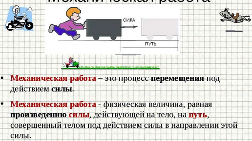 Всем привет! Сегодня на этом канале Вы читаете первую статью посвящённую физике. Я расскажу о таком явлении, как механическая работа. Эту тему изучают в 7-8 классе. Если Вы её ещё не изучили, хотите повторить или вообще не знаете что это, то Вам по адресу. Я расскажу о механической работе и приведу наглядные примеры. И так, начинаем: Механическая работа - что это Следует дать определение этого понятия. Вот оно: Надеюсь Вам стало понятнее, но скорее всего нет. Поэтому я расскажу более простыми словами:...
