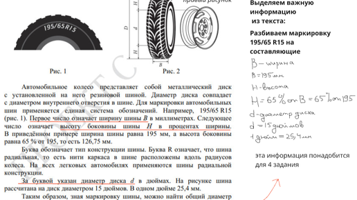 Предлагаю свой метод решения заданий 1-5 ОГЭ по математике по теме "Шины". Сложность задания типа "Шина" в том, что номера необходимо выполнять не по порядку. Сначала выполним номер 1, так как он самый легкий: Для решения данного номера не нужны ни вычисления, ни справочная информация из текста задания. У нас спрашиваю, какая наименьшая ширина для диска 15 дюймов. Чтобы узнать ответ - смотрим в таблицу, находим 15 дюймов. Видим 4 строчки. Из наших записей помним, что ширина- это первое число из маркировки...