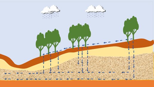 Подземные воды — воды, находящиеся в верхней части земной коры. Подземные воды образуются при просачивании дождевой и талой воды сквозь толщу горных пород. Способность горных пород пропускать воду зависит от размеров и количества пор, пустот, трещин. Чем крупнее частицы, тем шире поры и тем легче через породу проходит вода. Горные породы, пропускающие воду, называются водопроницаемыми, не пропускающие ее – водоупорными. Выпавшая на поверхность земли дождевая вода просачивается через водопроницаемые слои до тех пор, пока не встретит водоупорный слой...