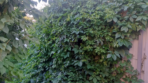Растет у меня девичий виноград уже более трех лет точно. Вырастила из черенков, нарезанных в знакомом саду. Выращиваю виноград в Западной Сибири, Кемерово. Может, поэтому так долго разрастался в сплошную стену. И в этом году он, как никогда, показал свой характер - застелил собою всю прилегающую землю. Вот так он висит на заборе, причем забрался не сам - натягивали шнуры, ставили решетки. И так застелил землю у своего подножия. Даже залез по ступенькам на площадку с мангалом. Ни разу за все лето его не подстригала...