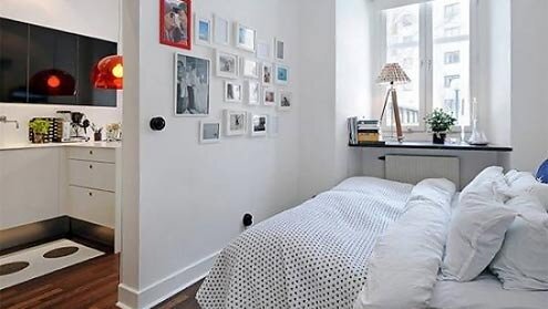Чаще всего, для малогабаритных квартир используют светлые оттенки красок, и мелкий принт на обивках и обоях, потому что тёмные цвета и крупный рисунок «съедают» пространство. Важно помнить, что глянцевая отделка увеличивает пространство, а матовая, наоборот, сужает.