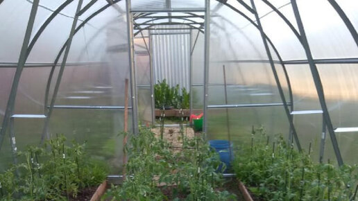 Давайте посмотрим на фото Если мы центральную гряду займем дорожкой, то полезную высоту теплицы мы будем использовать в пустую. Ведь тепличные томаты высокие и им нужно как можно больше места в высоту, а не упираться в скаты теплицы. Тоже самое огурцы. Нужно разбить место так, чтобы как можно больше было полезной площади. На боковые гряды высаживать низкорослые сорта, или перцы. Если гряда по середине, со всех сторон к растениям вы можете подходить свободно...