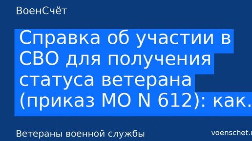 Справка участника СВО по приказу МО № 612 — основной документ, который подтверждает участие в специальной военной операции и нужен, чтобы оформить статус ветерана боевых действий и получить положенные льготы. КонсультантПлюс С 01.11.2024 г.: Справка об участии в СВО нужна для: Даже если часть льгот уже подтягивается автоматически по данным из государственной информационной системы, на практике МФЦ, соцзащита, банки и вузы до сих пор часто просят бумажную справку участника СВО или её электронный аналог с QR-кодом...