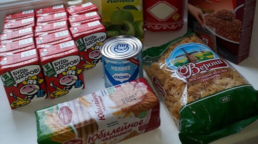 Набор продуктов льготным категориям учащихся на период карантина. Здравствуй,читатель!Вчера нам позвонили из школы,чтобы пришли забрать сухой паек,который положен ребенку в условиях карантина.Кстати ничего такого мы не ожидали,но тем не менее приятно,что социальная помощь оказывается нашим государством.Давайте посмотрим вместе,что же туда положили.Набор скромный,но на мой взгляд все нужное:пачка макарон,пачка гречки,пачка печенья,коробка сока,молоко 13 пачек,пачка сахара,банка сгущеного молока...