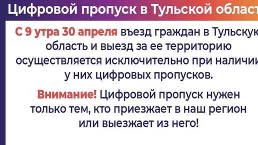 Правительство Тульской области усиливает контрольно-пропускной режим на дорогах в регион. Передвижение не блокируют, но, чтобы пересечь границу области, нужен будет пропуск, оформленный через портал «Госуслуги». С 9.00 30 апреля 2020 года при пересечении границы Тульской области вам понадобится электронный пропуск. Вы можете его оформить лично или за вас это может сделать работодатель. В первом случае действие пропуска распространяется на 24 часа, во втором пропуск будет постоянным. Для личного...