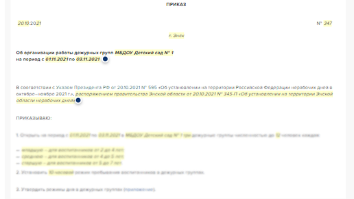 Минпросвещения распорядилось организовать в дошкольных учреждениях дежурные группы на время нерабочей недели с 30 октября по 7 ноября 2021 года. Чтобы открыть дежурную группу, издайте приказ. Укажите в нем день начала работы и режим. Если групп несколько, отметьте их количество. Отдельными пунктами пропишите поручения ответственным работникам. К приказу можете в виде приложений прикрепить состав групп и режим дня воспитанников. Приказ о работе дежурных групп в детском саду в связи с нерабочими...