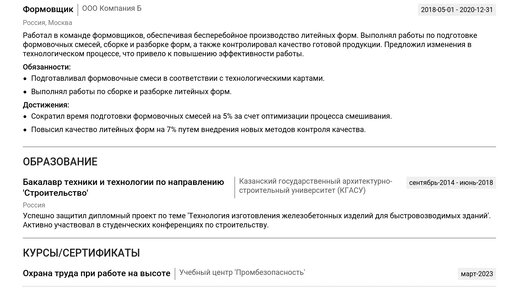 Пример резюме формовщика поможет вам увидеть, как правильно оформить свои данные для успешного трудоустройства. Изучение готовых примеров — лучший способ быстро создать эффективное резюме, которое выделит вас среди других кандидатов и увеличит шансы на получение работы. В этом материале вы найдете для разных ситуаций, по заполнению каждого раздела, а также узнаете, как учесть и какие выделить, чтобы ваше резюме работало на вас 👍. Мы дадим резюме под конкретные вакансии, которые будут полезны как начинающим, так и опытным специалистам...