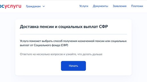 Удобный способ доставки пенсии можно выбрать в личном кабинете Госуслуг: на банковскую карту, либо на почте или через представителя. Для этого надо авторизоваться в Госуслугах и перейти по указанной ниже ссылке: Выбор доставки пенсии и социальных выплат Социального фонда России Если перейти по ссылке, указанной выше, то после авторизации в Госуслугах откроется окно "Доставка пенсии и социальных выплат СФР": Нужно нажать на кнопку "Начать" и ответить на вопросы. Можно оформить доставку пенсии себе, либо другому человеку - по доверенности...