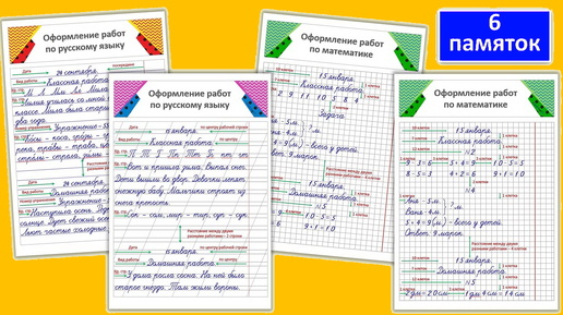 В этих памятках, оформленных как настоящие страницы тетради, собраны все основные правила оформления работ. Ваш ребенок всегда будет знать, как правильно записать задачу по «Математике» или упражнение по «Русскому языку». Для начальных классов. — 6 готовых шпаргалок (4 для русского, 2 для математики);