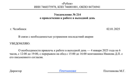 Нерабочие праздничные дни установлены статьей 112 ТК РФ. В 2025 году это новогодние каникулы 1-6 и 8 января, Рождество 7 января, 23 февраля, 8 марта, 1 мая, 9 мая, 12 июня и 4 ноября. Выходные — дни еженедельного непрерывного отдыха. Обычно это суббота и воскресенье, но при сменной или гибкой работе выходные выпадают на другие дни недели. Их фиксируют в графике или трудовом договоре. Если сотрудник работает в праздничный или выходной день, работу считают внеурочной и компенсируют по правилам ст. 153 ТК РФ...