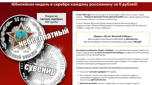 последствия, не слишком добросовестной рекламы. Бизнес и только бизнес на народной памяти. Лично хотел получить" юбилейную медаль в серебре каждому россиянину за 0 рублей" Навязчивая реклама идет как на ТВ каналах и радио, которые любят смотреть и слушать в основном пенсионеры (их проще в дальнейшем "обработать"). Так и в интернете. Все желающие могут получить, якобы бесплатно, но только за доставку и упаковку "всего" 349 рублей. Какова реальная себестоимость такая медальки-монетка (ни чего общего...