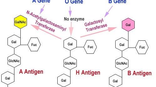 На мембране эритроцита есть специальные олигосахариды которые и определяют группу крови. К данным олигосахаридам могут присоединяться определенные антитела, а значит эти олигосахариды являются антигенами (так как они способны связываться с антиталми). Изначально на мембране эритроцита есть олигосахарид под названием H-антиген, который образуется за счет фермента фукозилтрансферазы, которая присоединеняет моносахарид фукозу к галактозе на определенных гликопротеинах и гликолипидах в мембране эритроцитов...